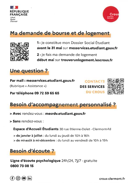 Bourse, logement, restauration, culture, aides sociales, écoute psychologique, ...