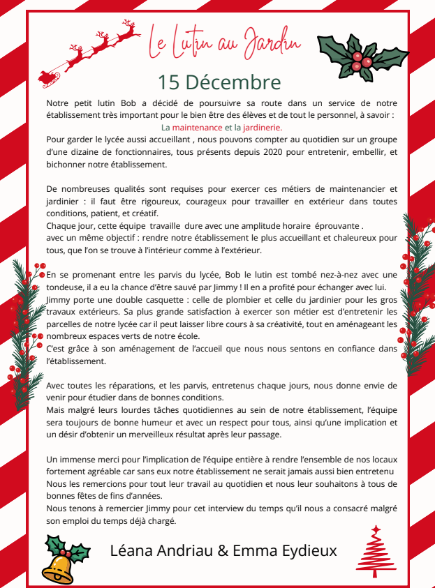 Notre petit lutin 🧝♂️ a poursuivi sa route au cœur d’un service essentiel de l’établissement : la maintenance et la jardinerie 🌱🛠️.