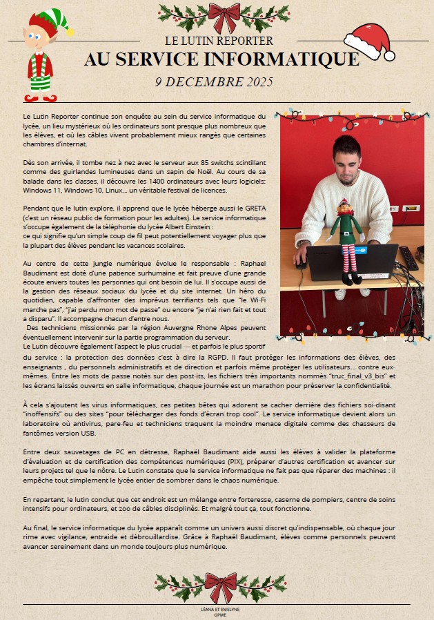 🎅✨ Le Lutin Reporter poursuit son enquête, cette fois au cœur du mystérieux service informatique du lycée… un endroit où les ordinateurs sont presque plus nombreux que les élèves 💻👀 et où les câbles sont mieux rangés que certaines chambres d’internat 🎒😅.